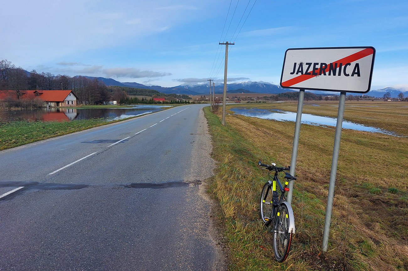 Nazad až nad Teplice rovnakou cestou, aj ten brod na okraji Rovnej hory mi podvozok znovu parádne umyl, ale už sa lepšie išlo, so sviežou podporou do chrbta. Taký príjemný, teplý, jarný vetrík - šľak ho traf na začiatku januára :-) A cesta skoro suchá. Chcel som sa samozrejme čo najviac vyhýbať hlavným cestám, tak som štrikoval kadejako cez Turčiansky Michal, cez oba Čepčíny a Ivančinú. Kadejaké jazierka aj v strede polí, jedno dokonca s ostrovom aj polostrovmi :-) Akurát v pozadí za nimi ten smutný pohľad na ledva pocukrované kopce Veľkej Fatry, aaaach jo...