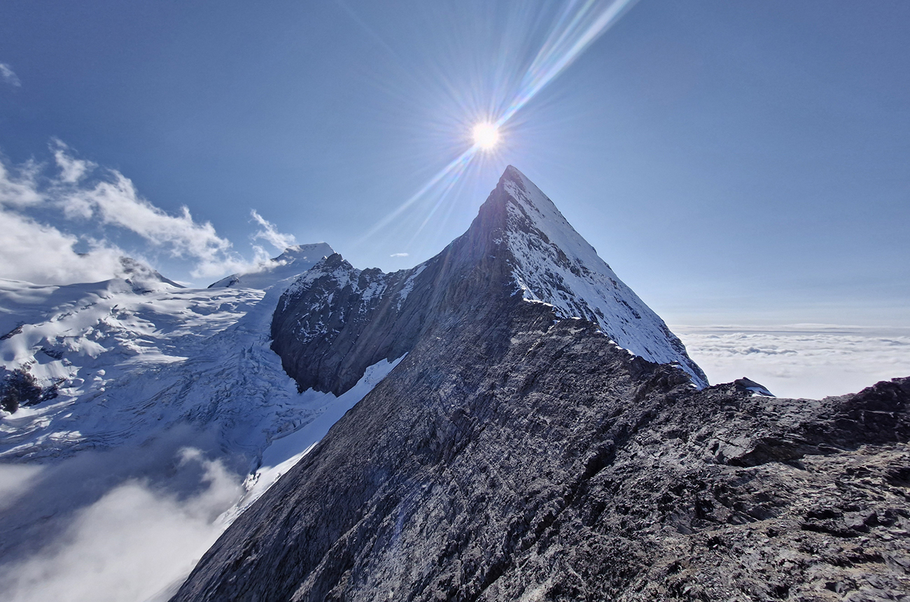 Dopoludnie: Vychádza slnko, vypíname čelovky a pokračujeme hrebeňom. Horizontálne úzke úseky sa striedajú s lezeckými pasážami. Snehu pribúda v oboch, ale väčšinu stále lezieme simultánne. Keď sa objavia prvé fixy, mladí nám trochu odlezú na jednu - dve dĺžky. Vzájomná komunikácia trochu ustane, zato však postupne tvrdne terén. Viac a viac si netrúfame liezť simultánne, a i hľadanie vhodných miest a budovanie vlastných štandov zaberá čas. I cesta naspäť na chatu je každým ďalším výlezom uzavretejšia. Prestávam trochu vnímať, ako rýchlo sa slnko presúva po oblohe, sústredím sa na lezenie. Väčšina ma baví, občas je náročnejšie. Každú chvíľu vyhliadam, kedy nám prvý párik zmizne zlaňákom z Grosser Turm, ktorý má veštiť záverečný výšvih na Eiger.