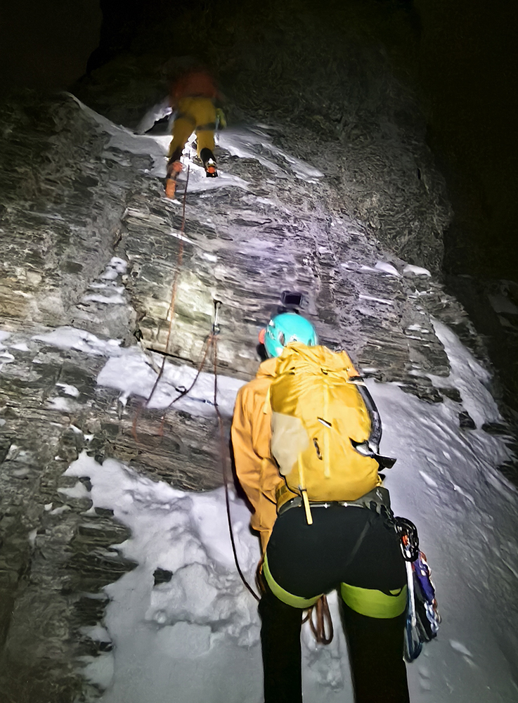 Prvý problém však nastáva ešte za tmy. Ďalšia stienka je už prisnežená a primrznutá. Zakladať nie je kam, nity, ak by tam aj nejaké boli, kvôli snehu nevidíme, a bez cepínu to na prvom konci nejde. Obe dvojice to však na hornú plošinu nakoniec zvládneme bez zásadných problémov, týpkova beta mi tu i v ďalších pasážach veľmi pomáha. Nikto si v tej chvíli ešte neuvedomuje, že bezpečnú cestu naspäť na chatu si týmto výlezom komplikujeme - horná plošina je zasnežená, na nájdenie zlaňáku by bola potrebná lopata alebo ešte lepšie snežný pluh, a založiť alebo obhodiť nejde nič.