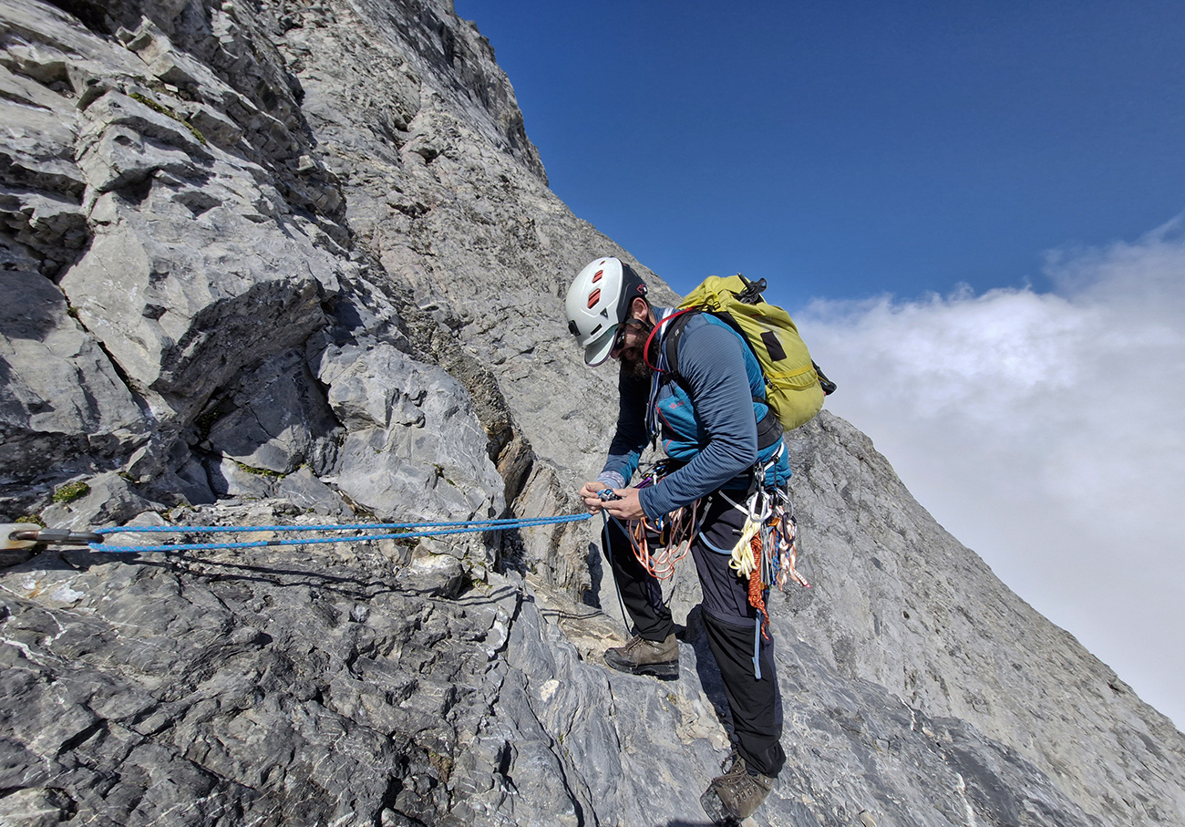 Doliezam na horizont a v diaľke vidím párik, konečne sú pri zlaňáku na Grosser Turm. A nad nimi sa týči posledný, dlhý výšvih na Eiger. To je ešte strašne veľa lezenia, napadne mi. To nemáme šancu dať! Pozerám na hodinky, je pol jednej a na ceste sme už sedem a pol hodiny. A odtiaľto vyzerá vrchol na ďalšie štyri - päť! V tej chvíli na mňa párik zakričí: Musíme to zabaliť, to nemá zmysel!